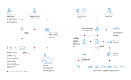 At a temperature of -56.6 °C (-68,88 °F), carbon dioxide gas changes to a liquid state. Hydrogen, on the other hand, changes at a temperature of -252.9 °C (-423,22 °F). Rheonik Coriolis mass flow meters can reliably and accurately measure both liquid and gas states, making them a valuable addition to H2 and CO2 processes.